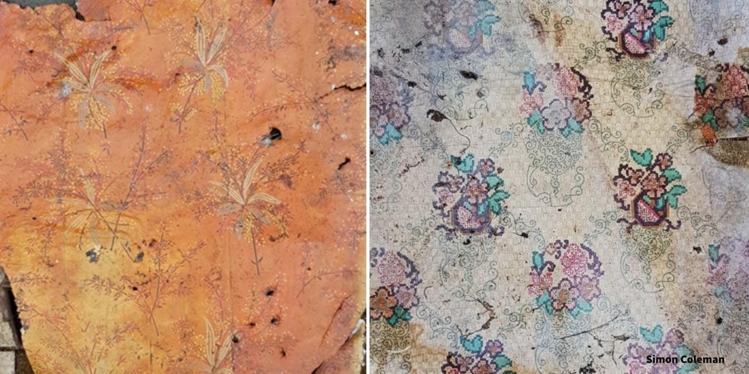 Inside the shed there was little of value but some areas had been clad with some interesting materials. It has tropical-style bitumen-backed wallpaper, probably from the 1950s, and a floral lino possibly dating from the early 1960s.