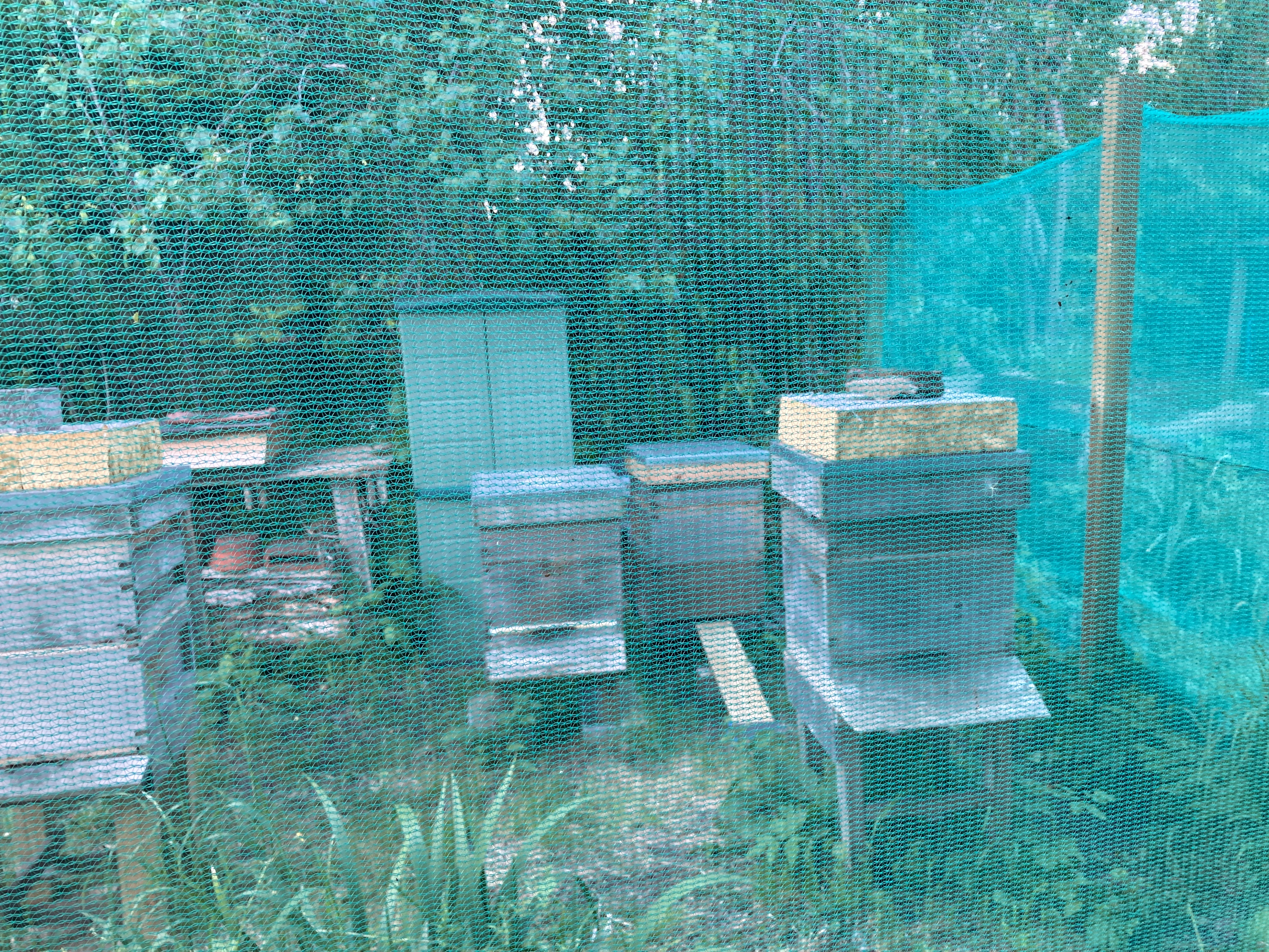 Beekeepers Tana, Kathy and friends were soon on hand to bring the swarm back to earth, with the help of a sawn-open water container attached to a long pole.